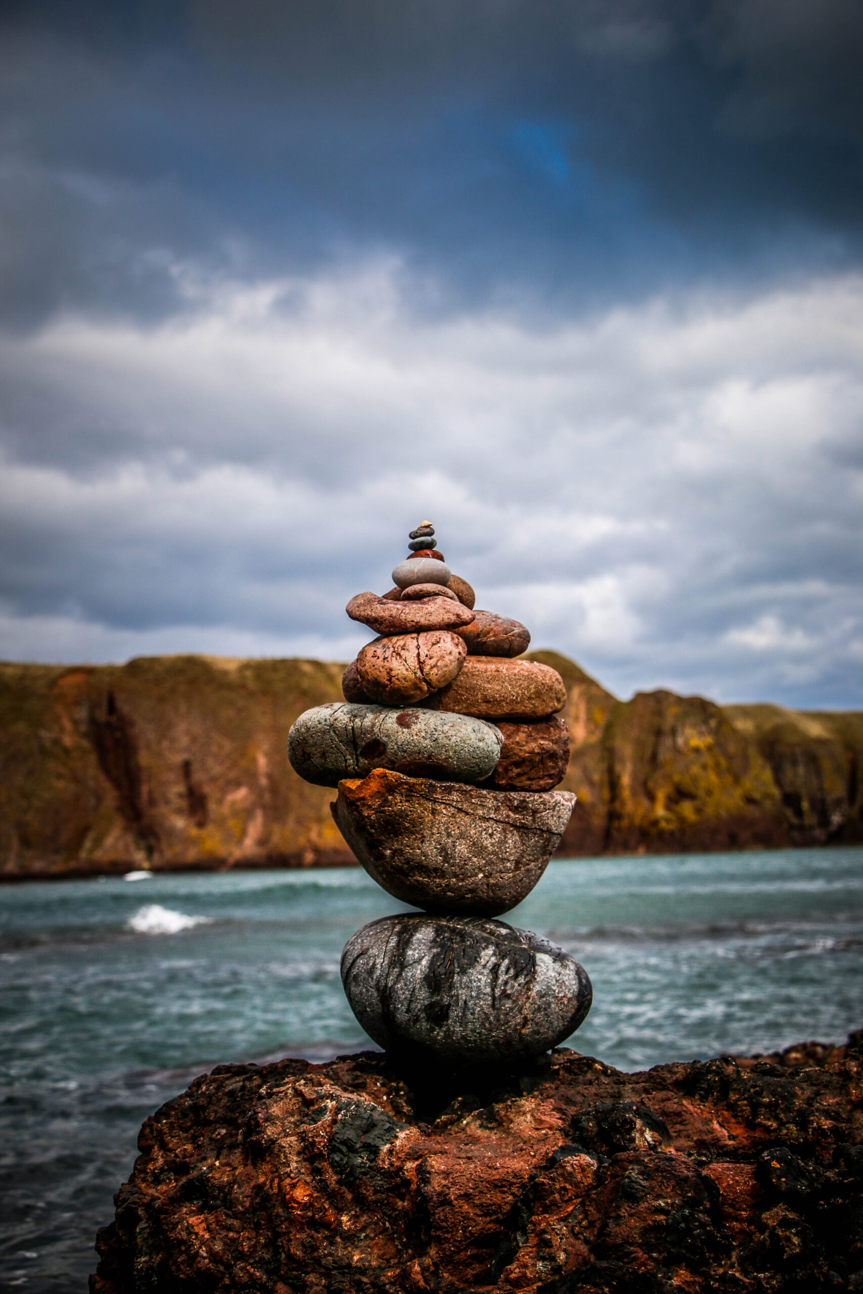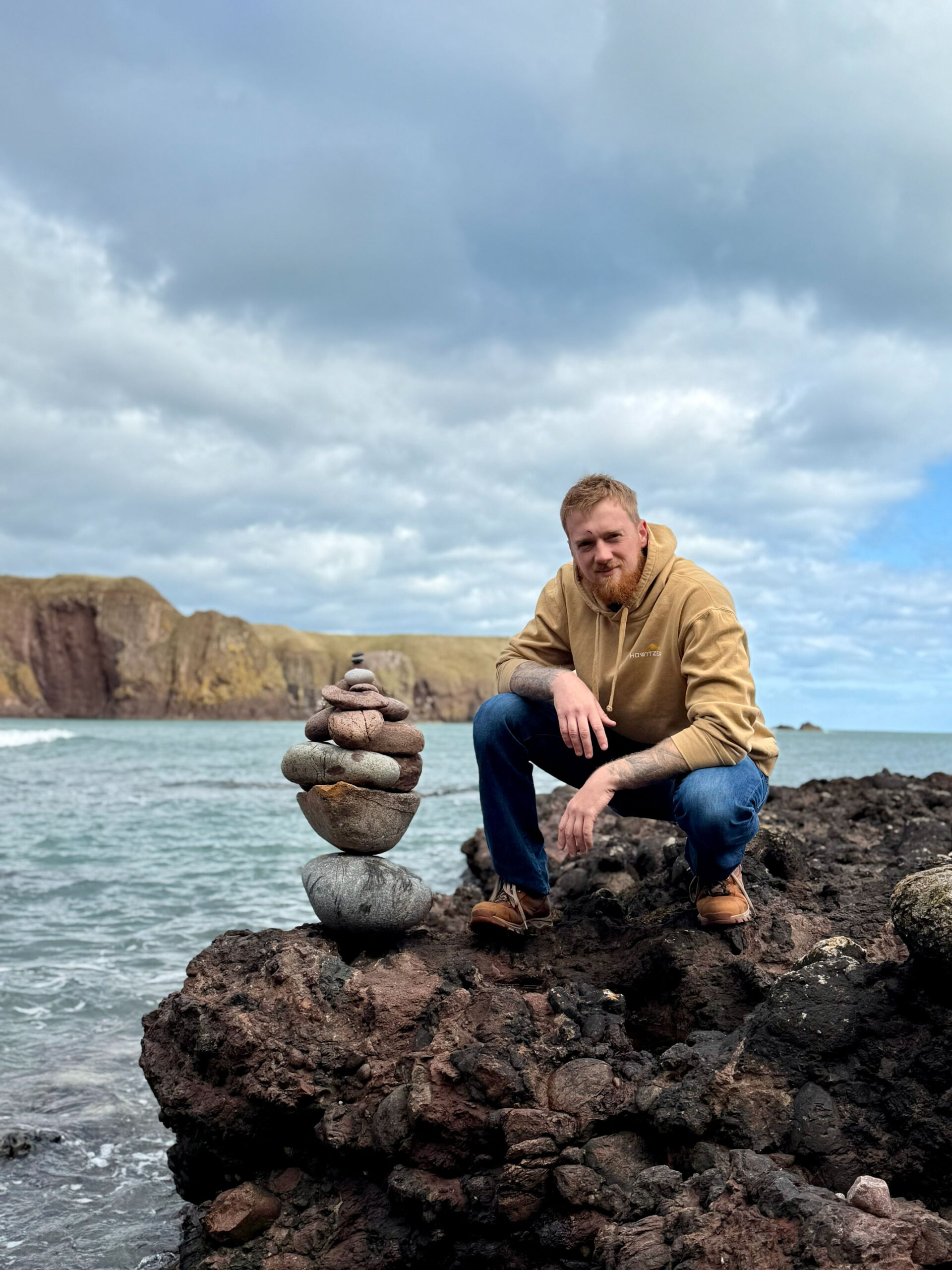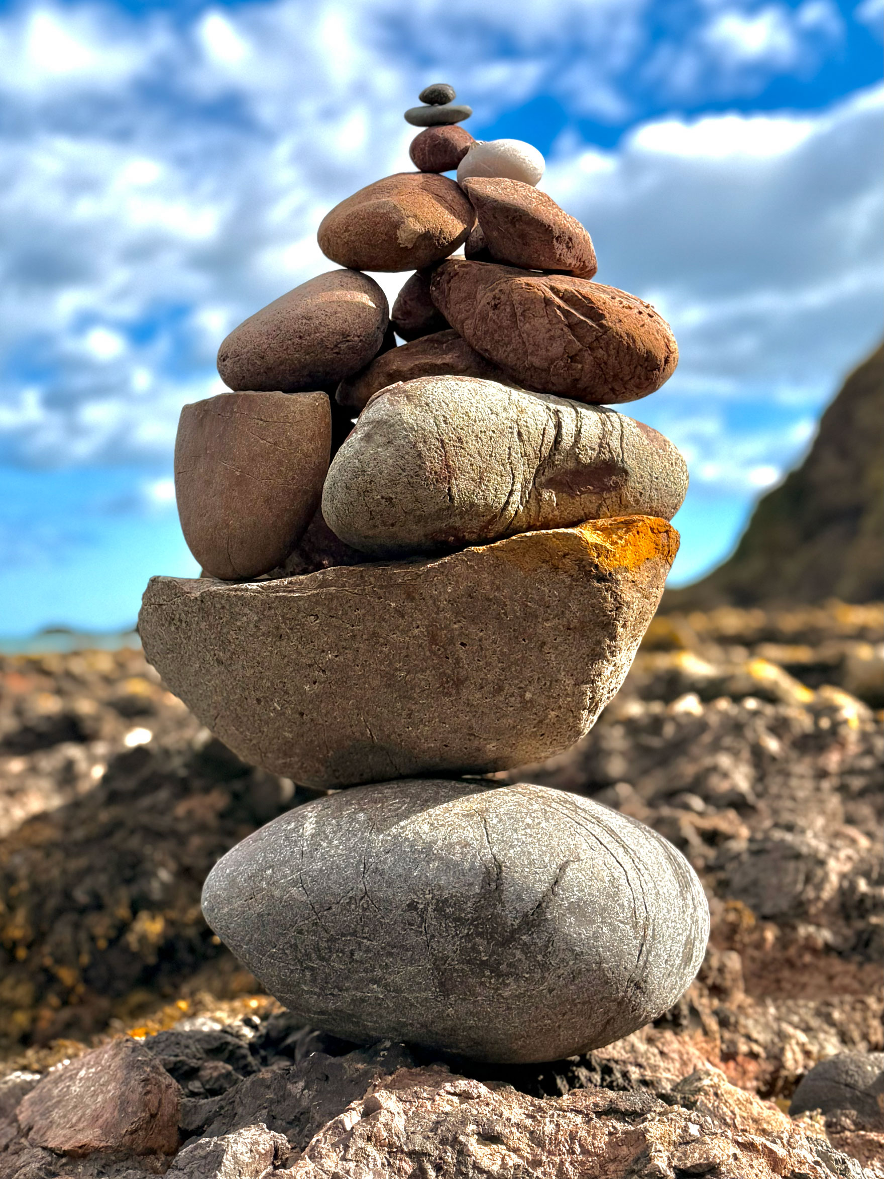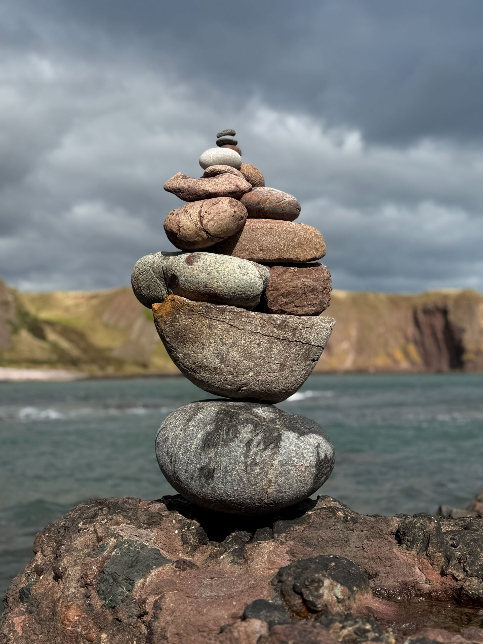 Ashton climbed, chasing the wind, and we explored the lower vaults and found a quiet corner where the sea framed the world perfectly. Later, we made our way down to the shore, the cliffs softening into a stretch of stone and sand. We built a cairn… I found the perfect rocks, Ashton played engineered – together, we created a tower of patience and symmetry. It stood against the wind as if it belonged there. A small monument to a perfect day.
