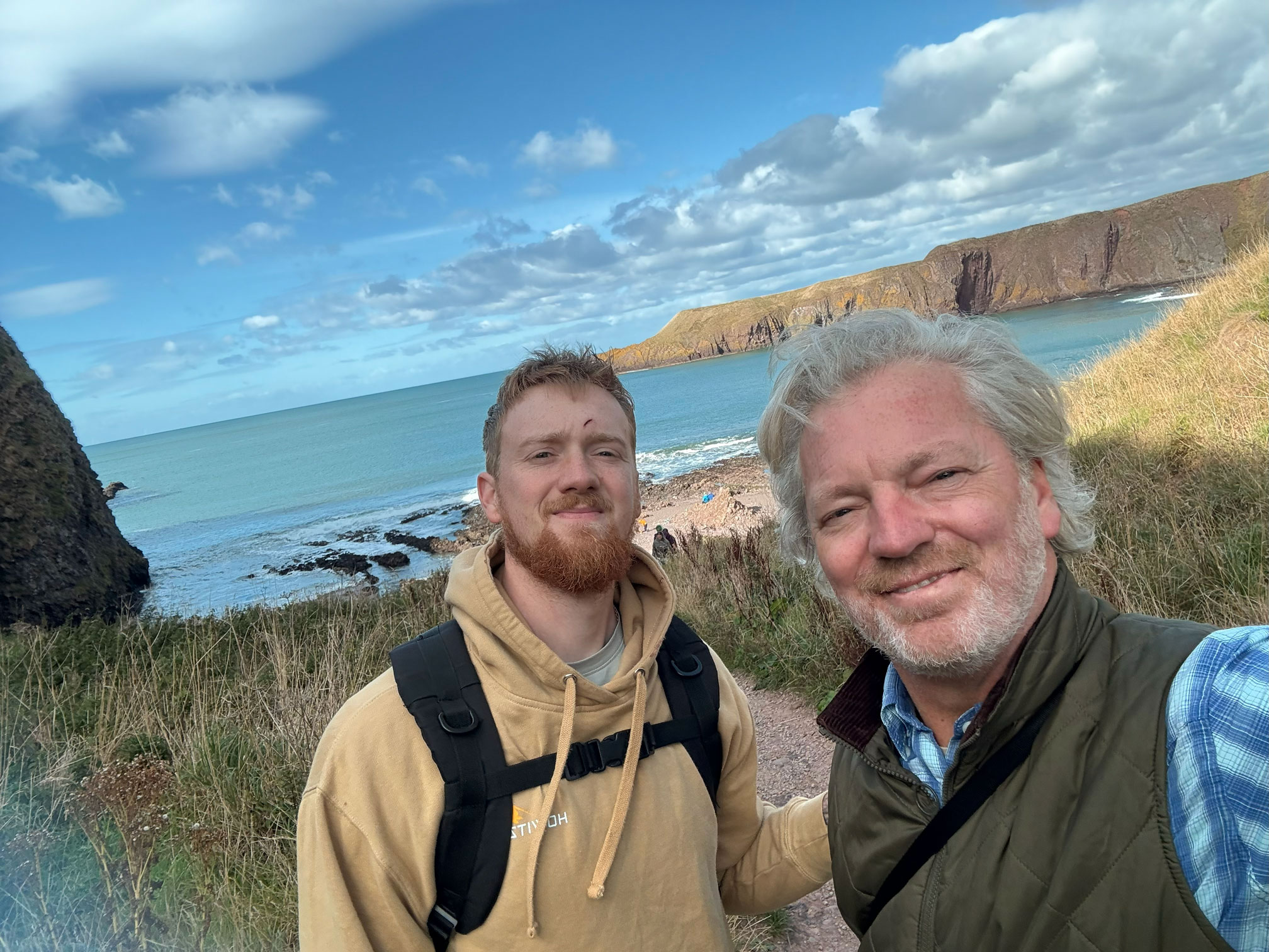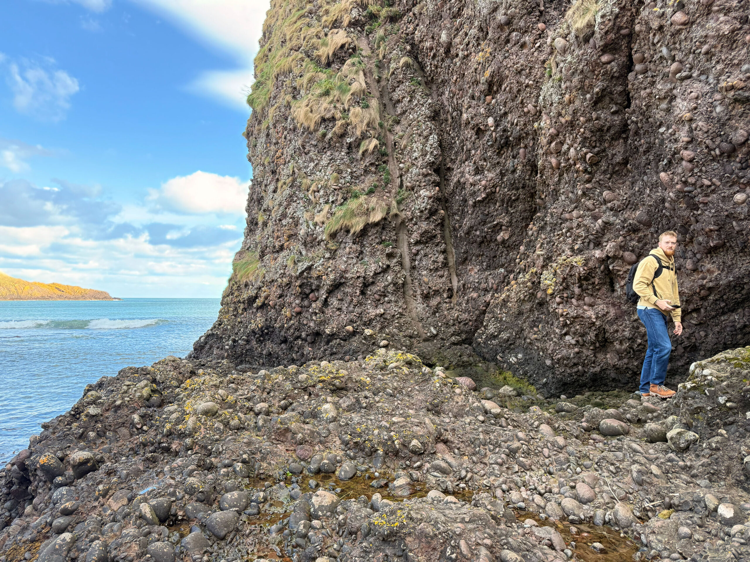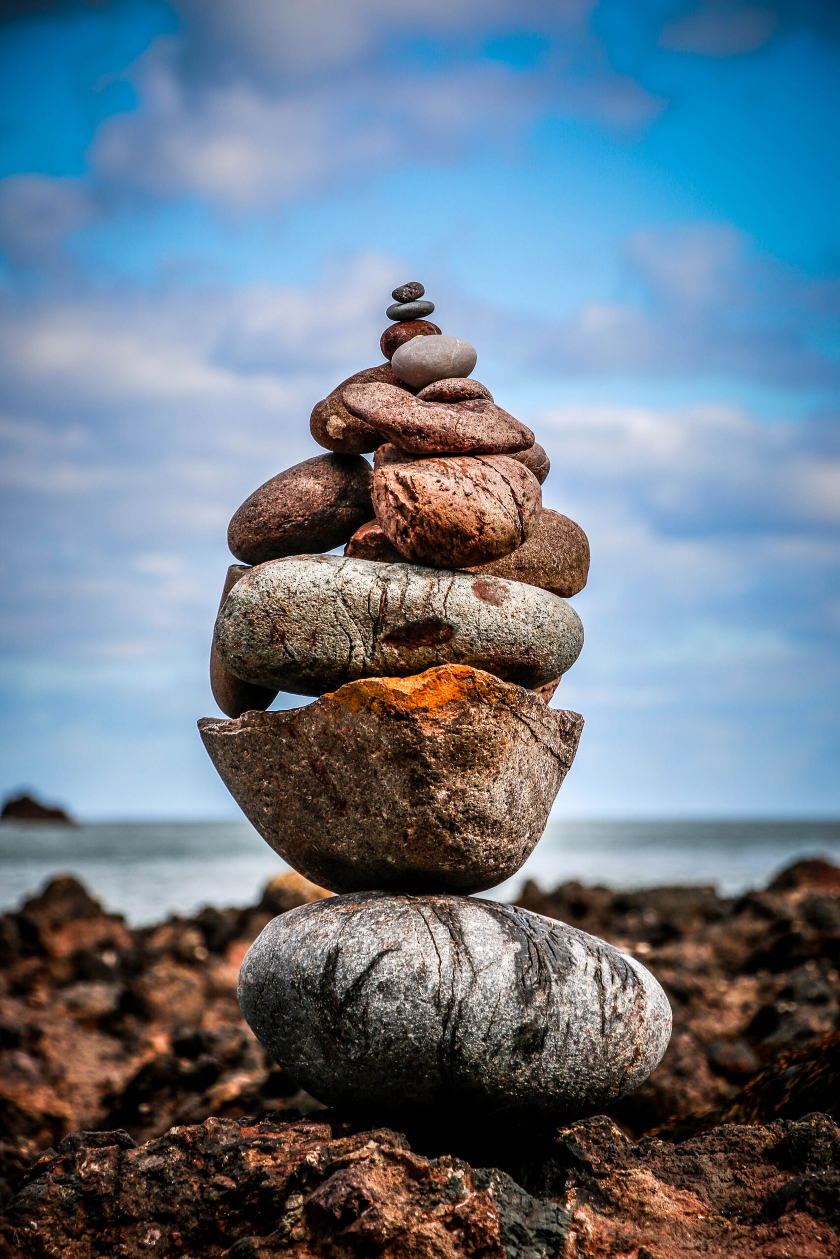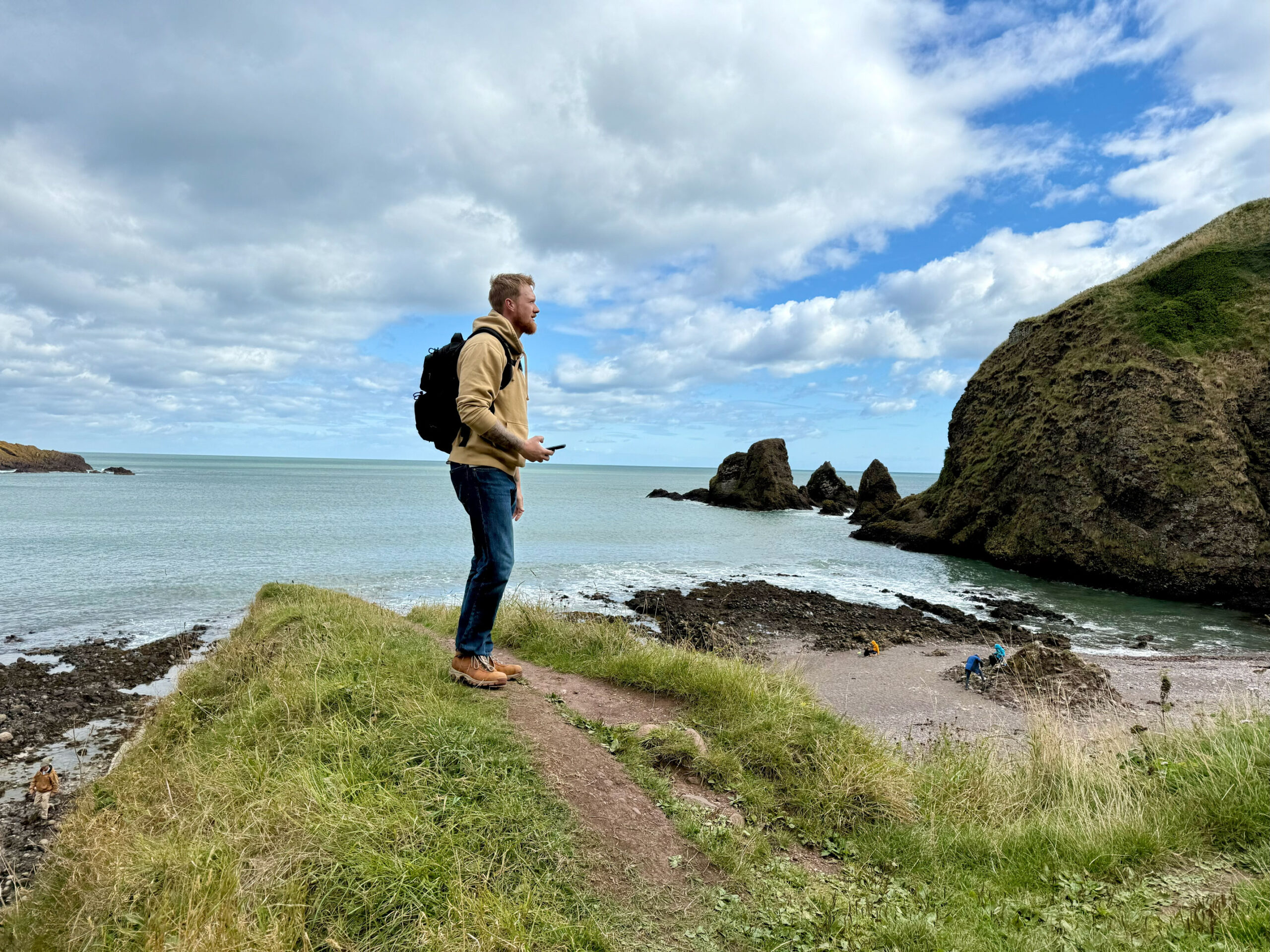 Ashton climbed, chasing the wind, and we explored the lower vaults and found a quiet corner where the sea framed the world perfectly. Later, we made our way down to the shore, the cliffs softening into a stretch of stone and sand. We built a cairn… I found the perfect rocks, Ashton played engineered – together, we created a tower of patience and symmetry. It stood against the wind as if it belonged there. A small monument to a perfect day.