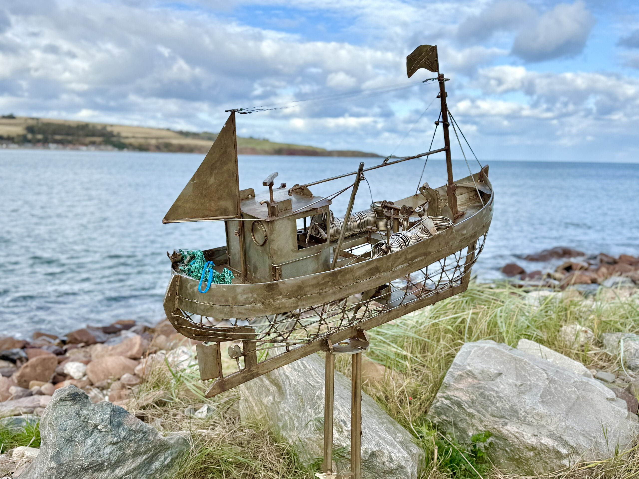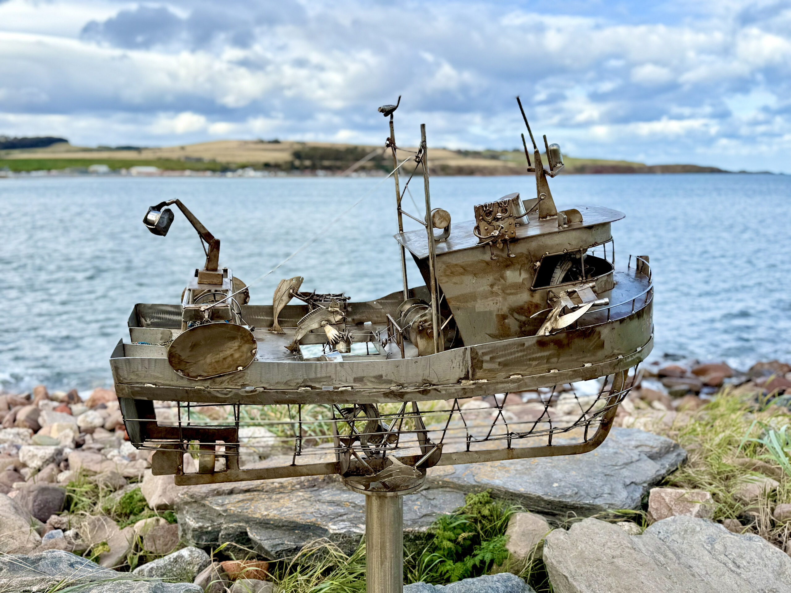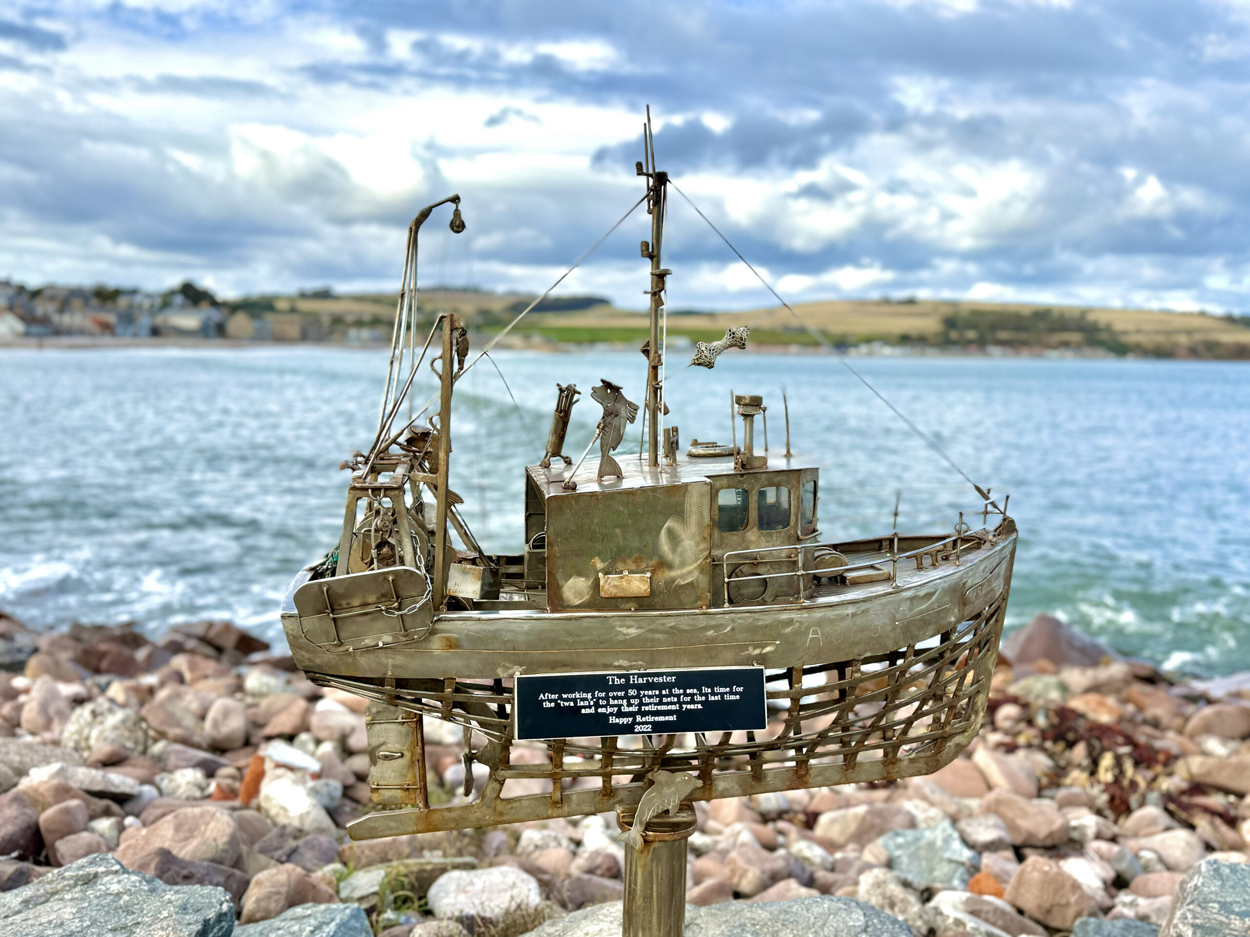 We walked the harbor walls, where bright boats rested in calm water, their reflections shifting with the sky. Along the shoreline stood a series of metal sculptures – intricate models of old boats, fishing vessels and more, that once sailed the North Sea right there. Each one named, each one honored, their stories welded into steel so they’d never drift too far from home.