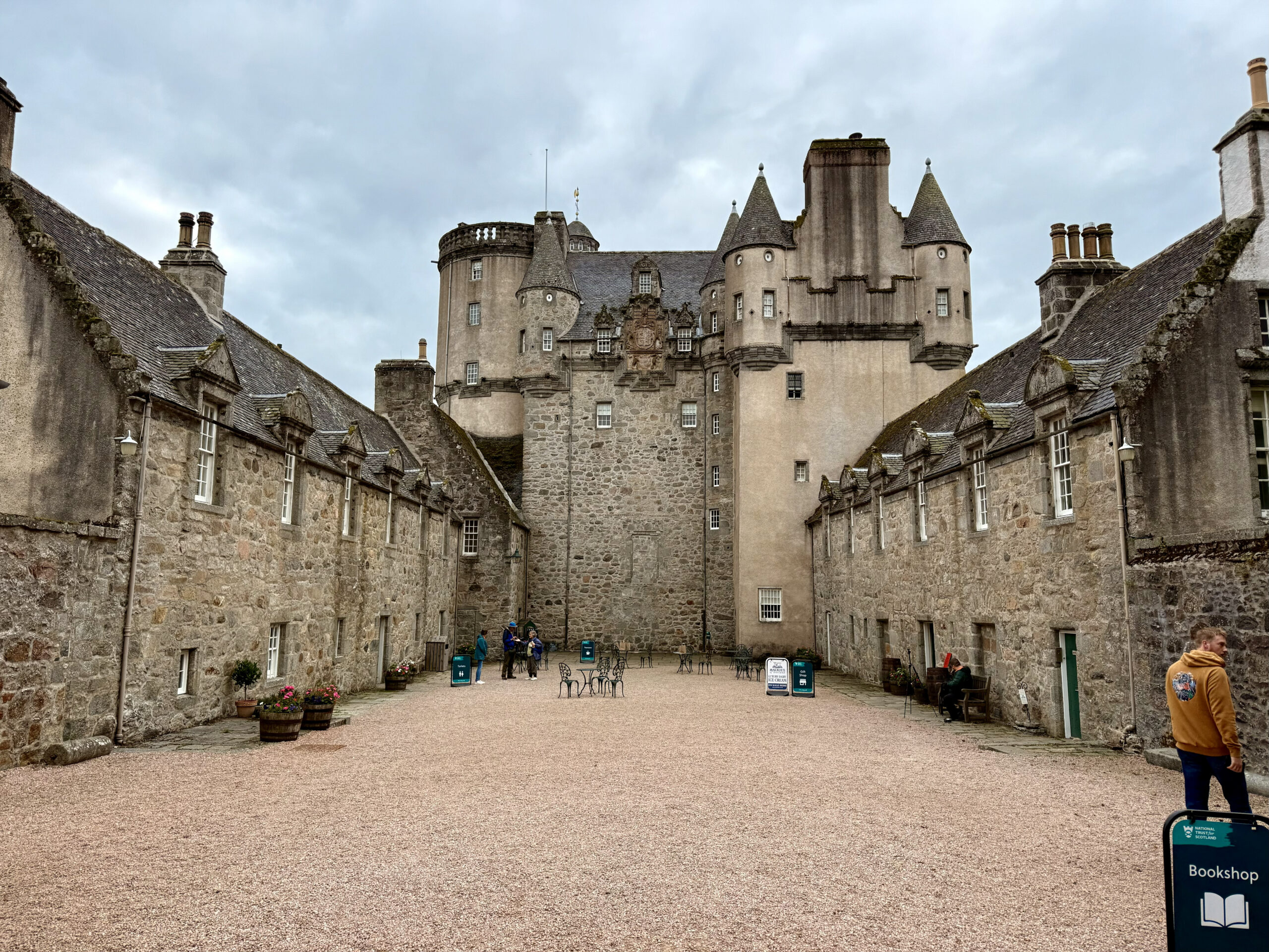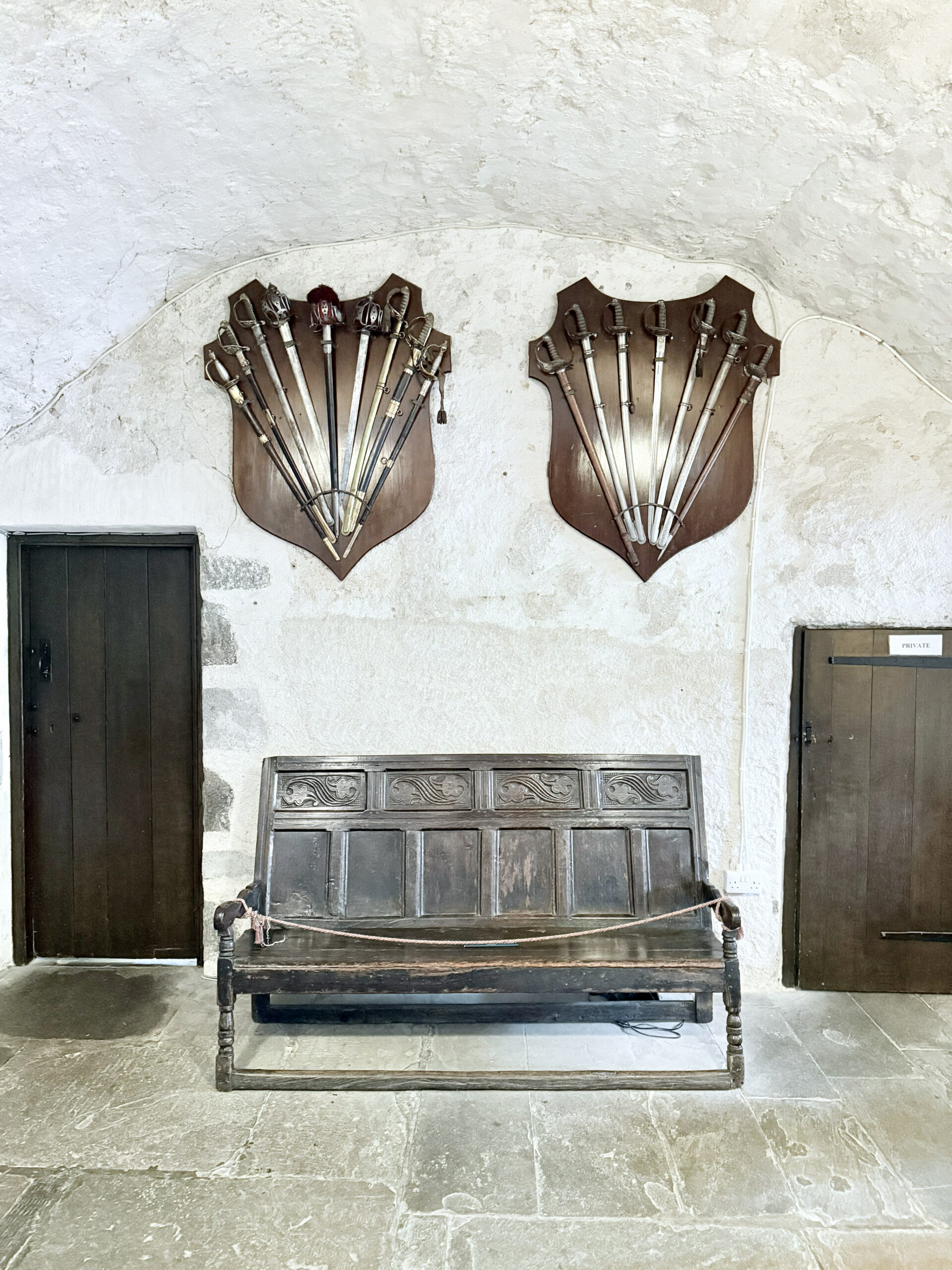 After the goose fields emptied and the sky softened, we traded camo for quiet and drove back north toward our stay and Fraser Castle, nearby. The place feels timeless – part fortress, part fairytale – with its stone walls rising against the gray. I wandered slow, tracing my hand across weathered doors, worn steps, and windows that have seen more history than a dozen lifetimes.