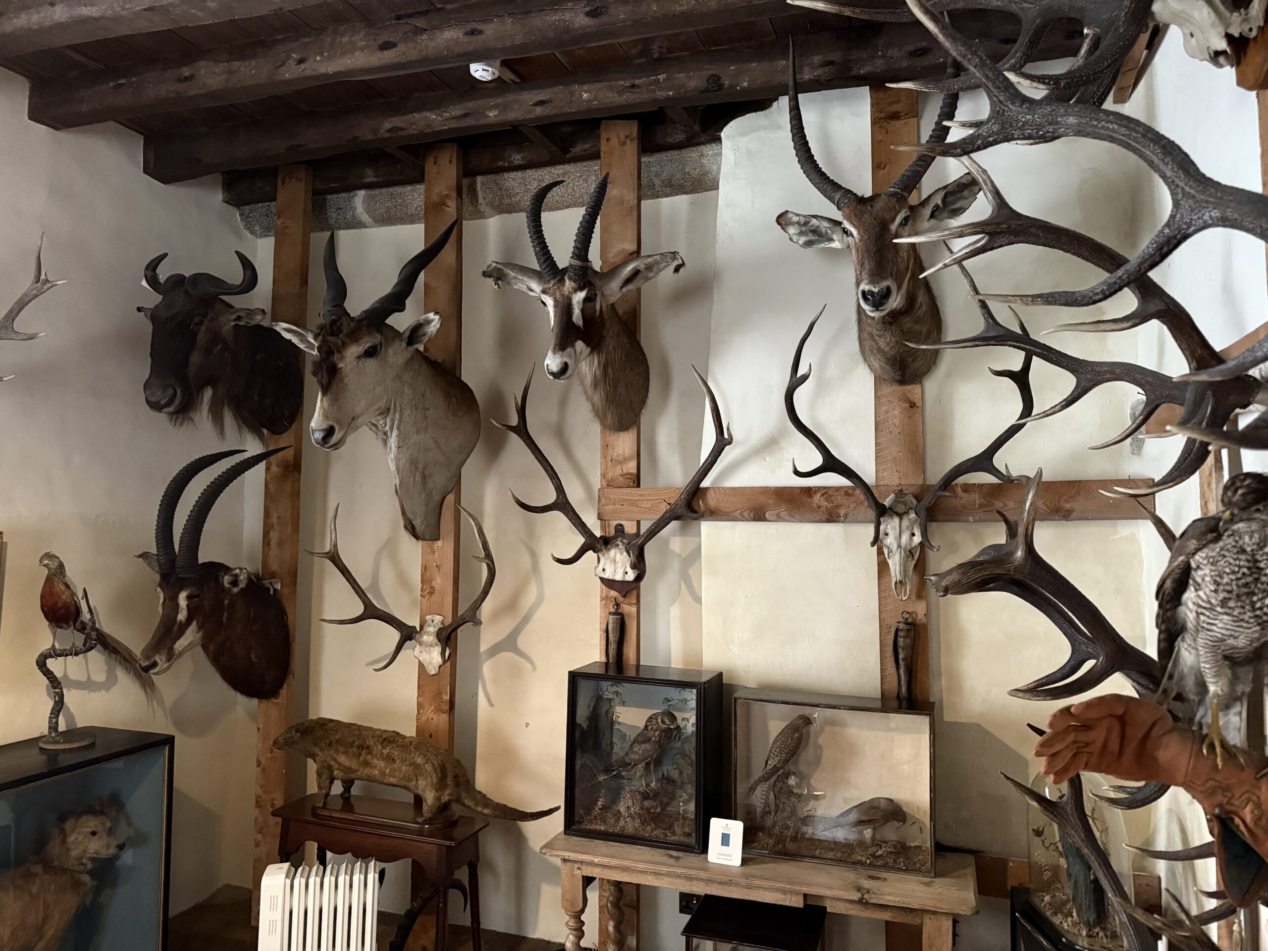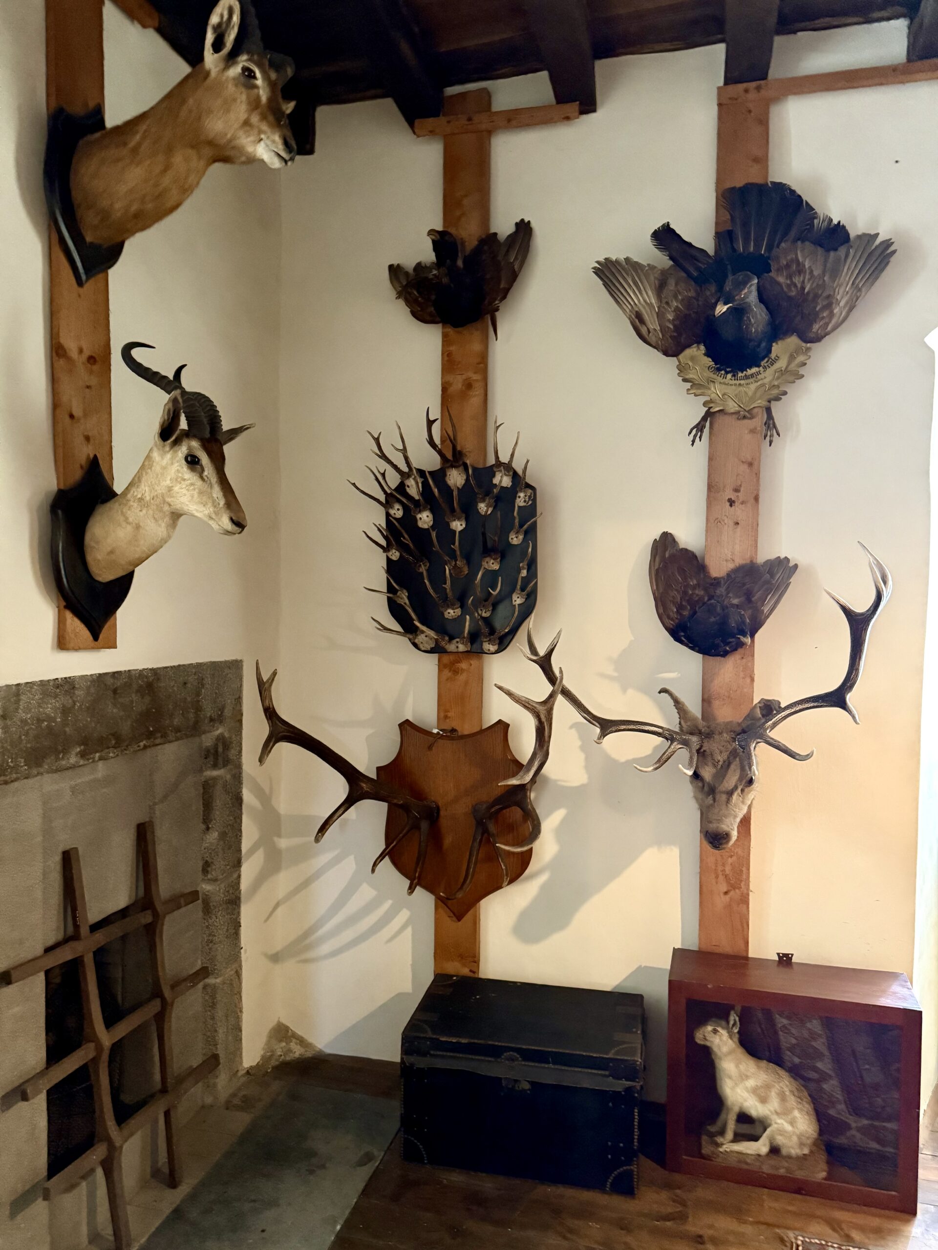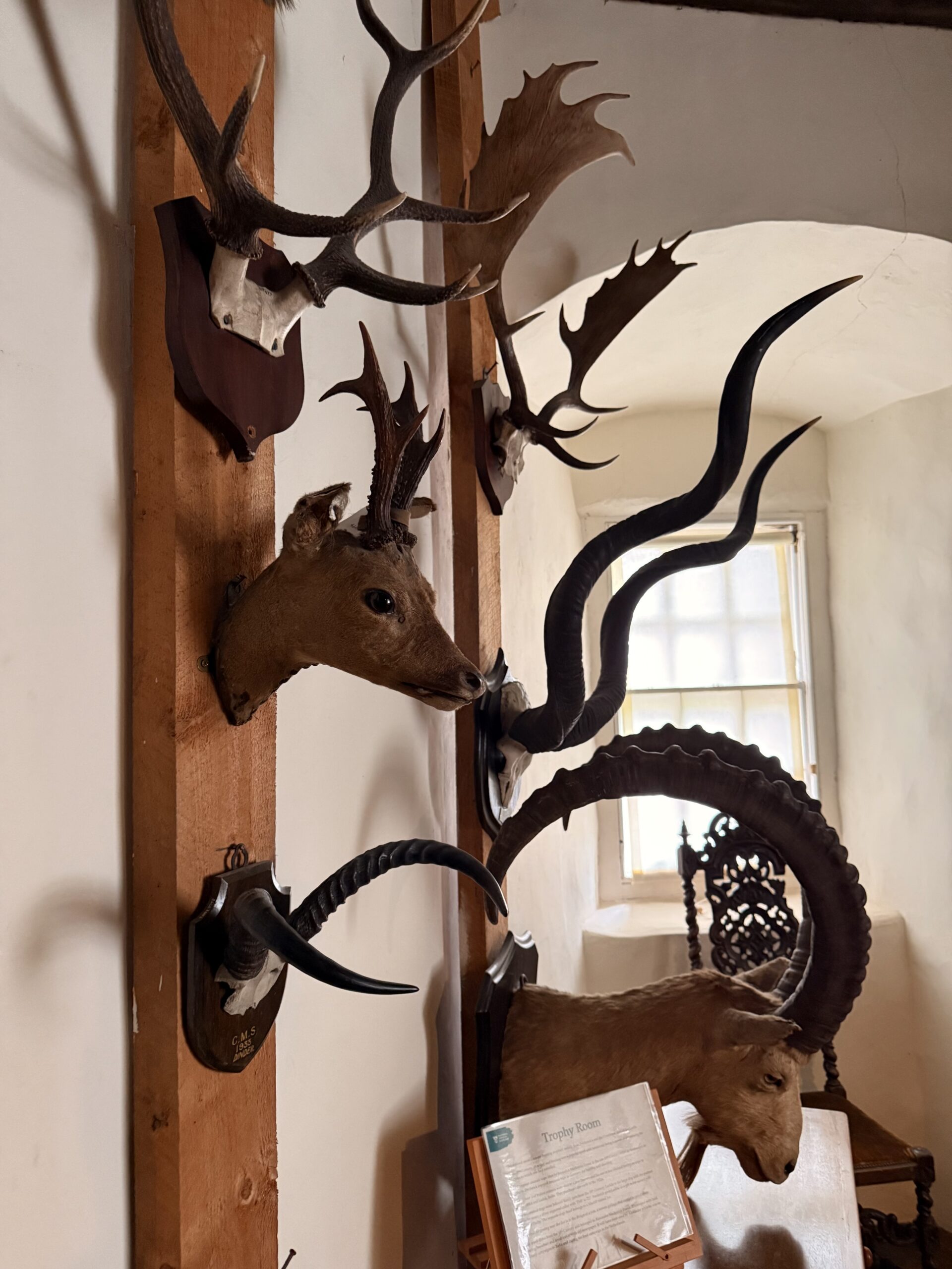 Inside, we stepped into the Trophy Room – a space that stopped us both in our tracks. Antlers and horns from across continents lined the walls, every mount a story, every shadow a reminder of generations who came before. It wasn’t just a display of hunting; it was a heritage, captured in wood and fur and bone.