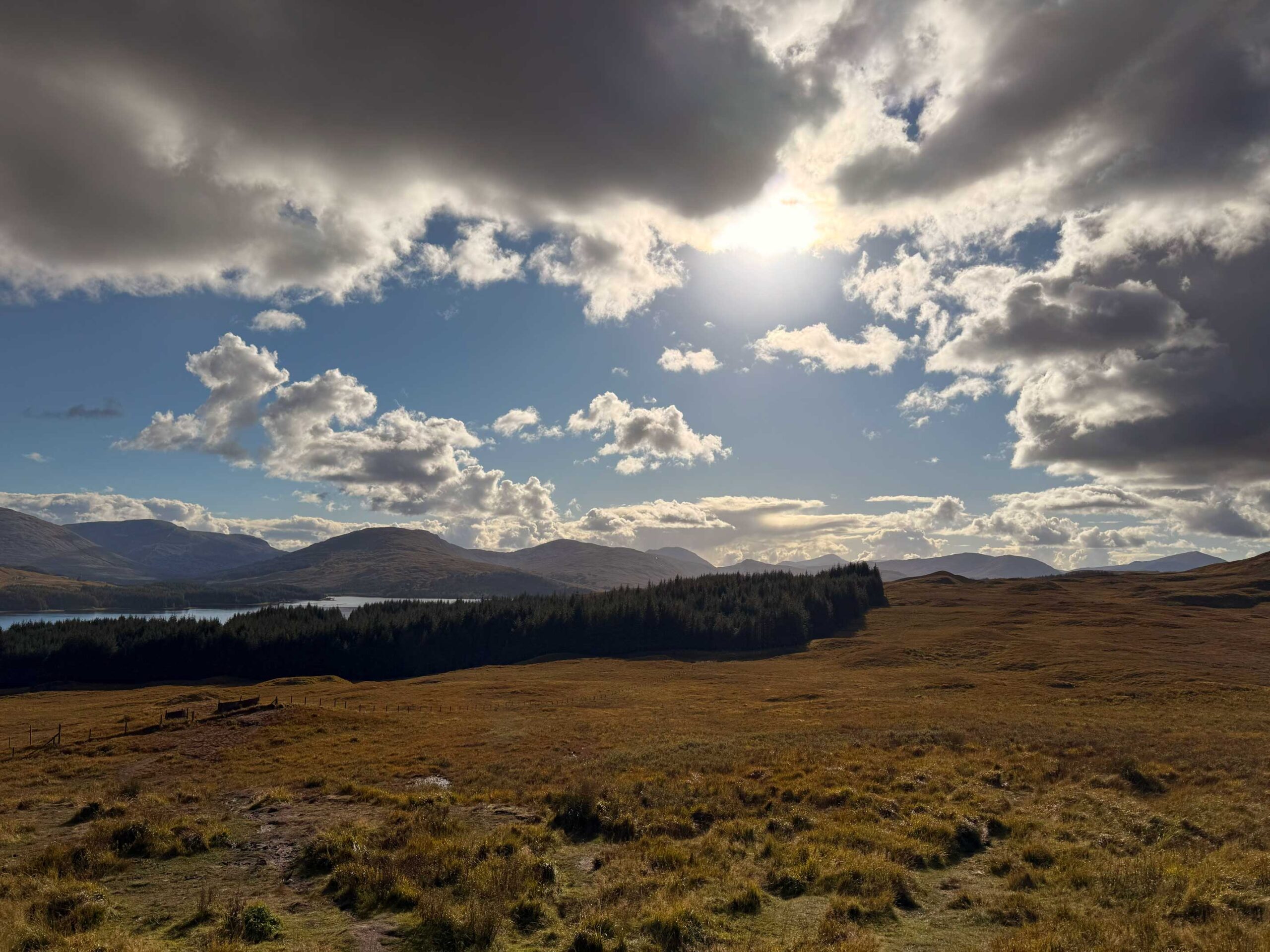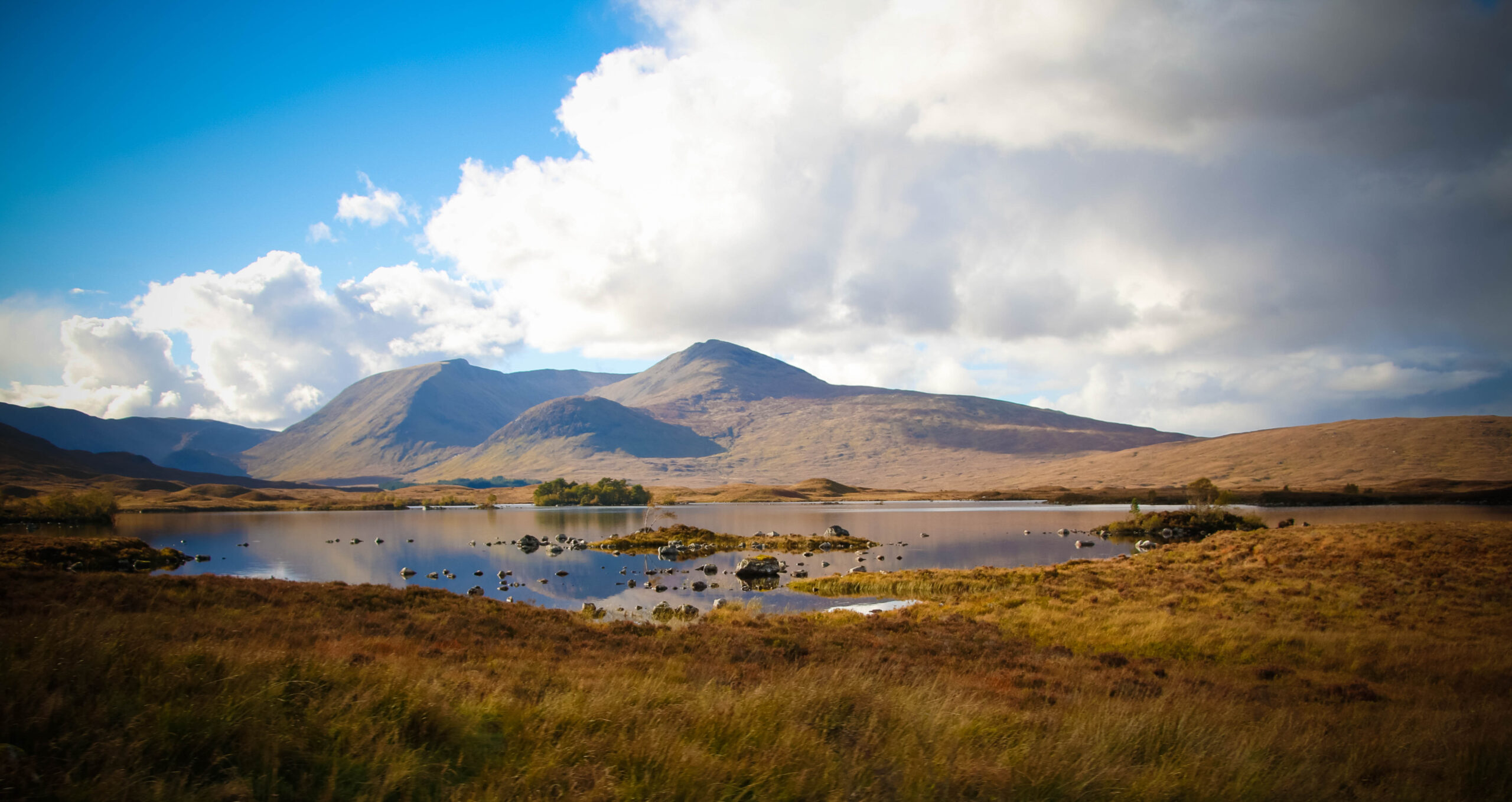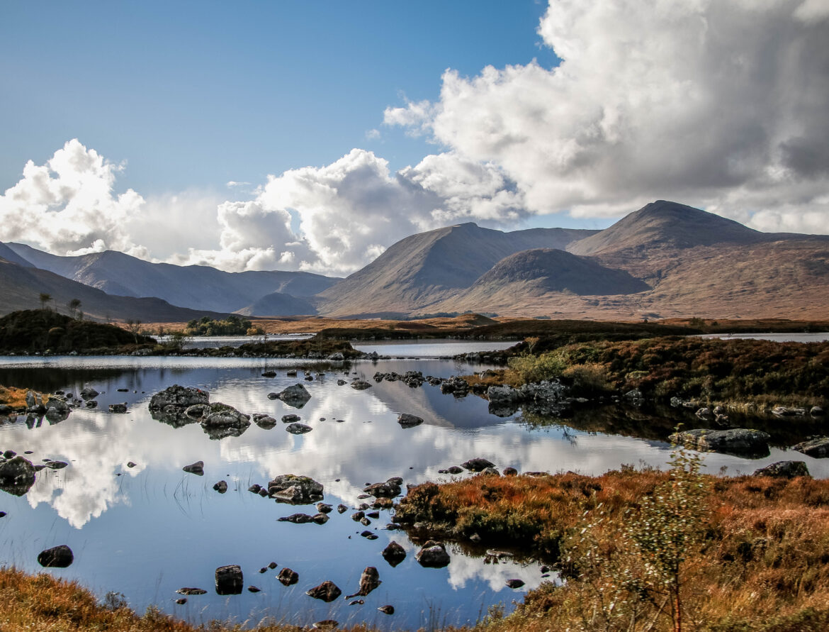 Then came the road. And oh… the road. We passed through Highland country so breathtaking, we forgot to speak. We pulled over again and again just to try – try… to catch it. Lochs mirrored the sky, clouds and hills tangled in their reflection. Peat-colored hills rolled forever. Sunlight broke through in golden streaks like something divine. In one moment, a still loch, broken only by scattered rocks, reflecting sky, mountain, and silence… The photo says more than I ever could.