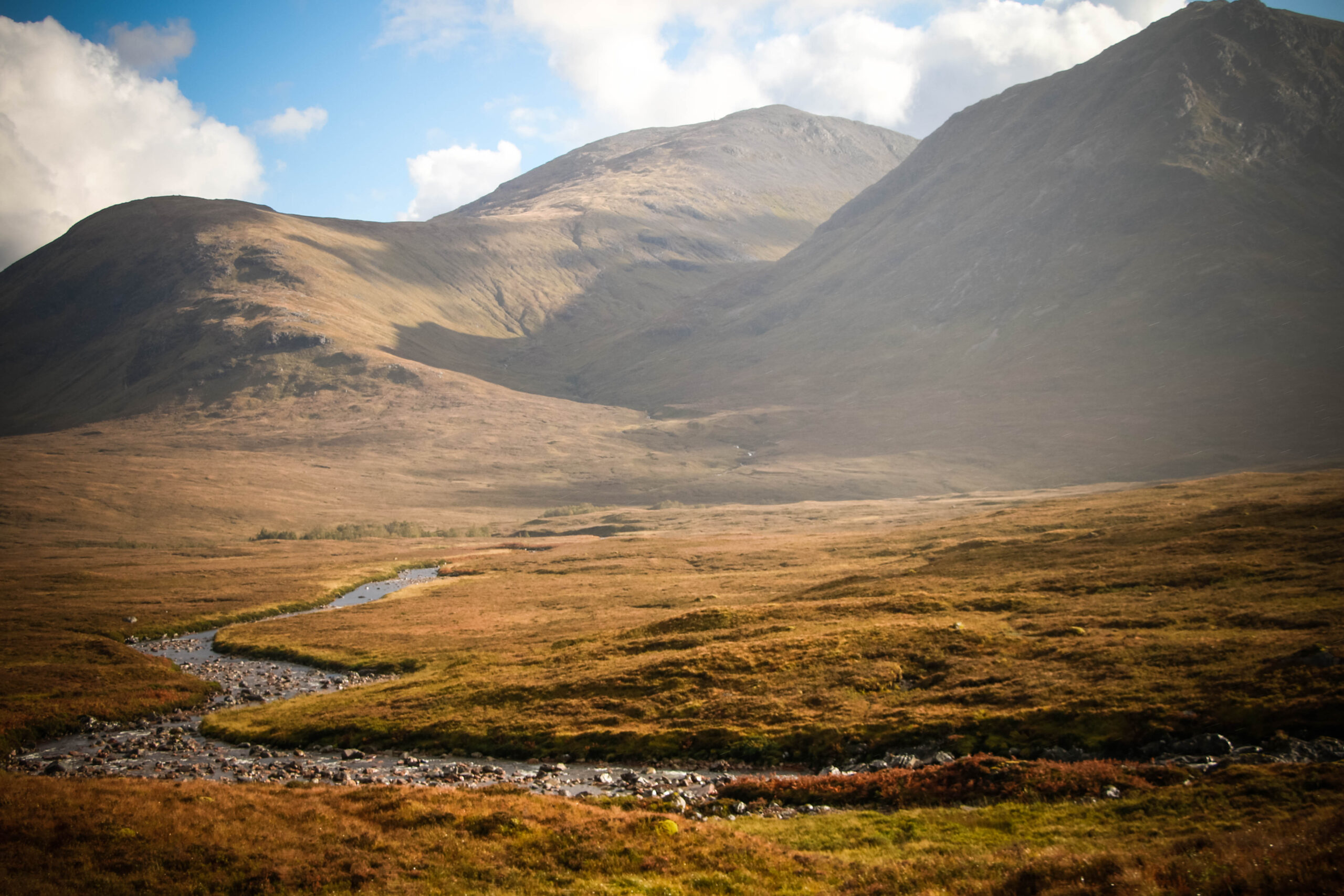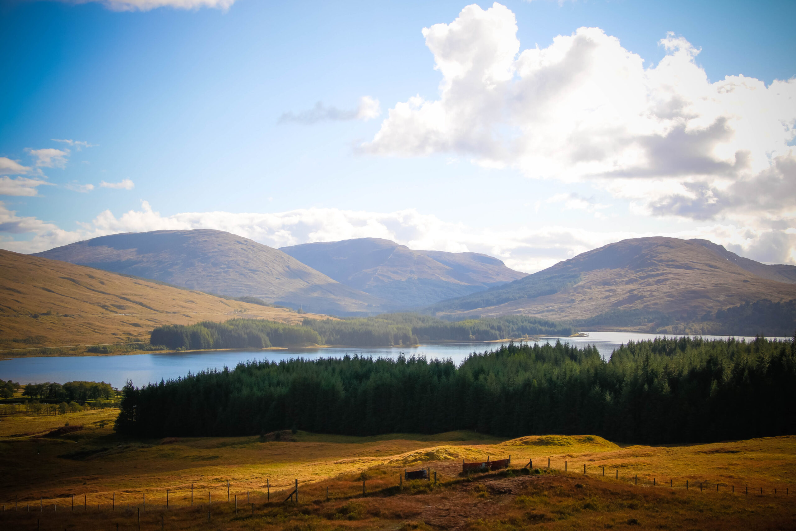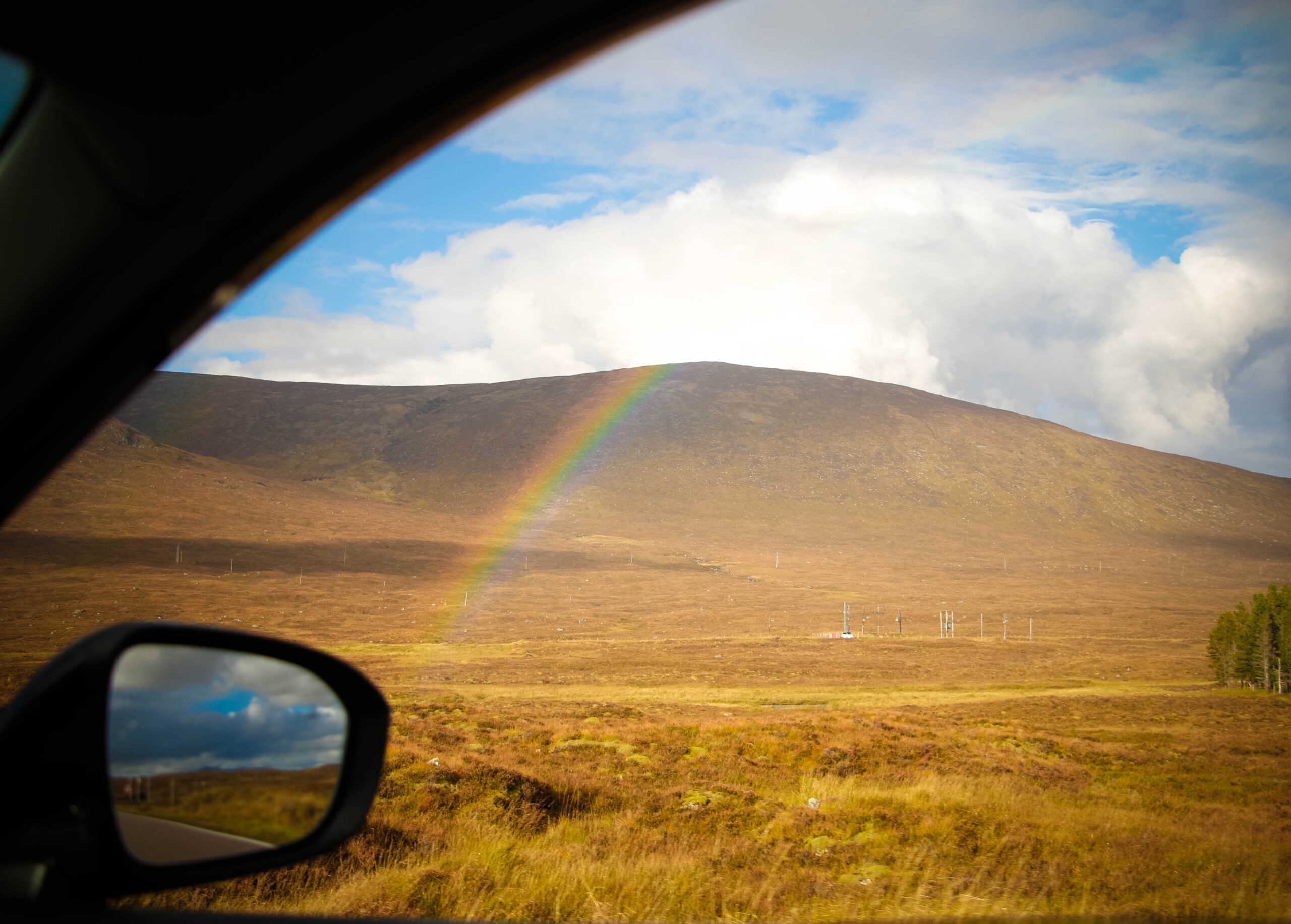 Then came the road. And oh… the road. We passed through Highland country so breathtaking, we forgot to speak. We pulled over again and again just to try – try… to catch it. Lochs mirrored the sky, clouds and hills tangled in their reflection. Peat-colored hills rolled forever. Sunlight broke through in golden streaks like something divine. In one moment, a still loch, broken only by scattered rocks, reflecting sky, mountain, and silence… The photo says more than I ever could.